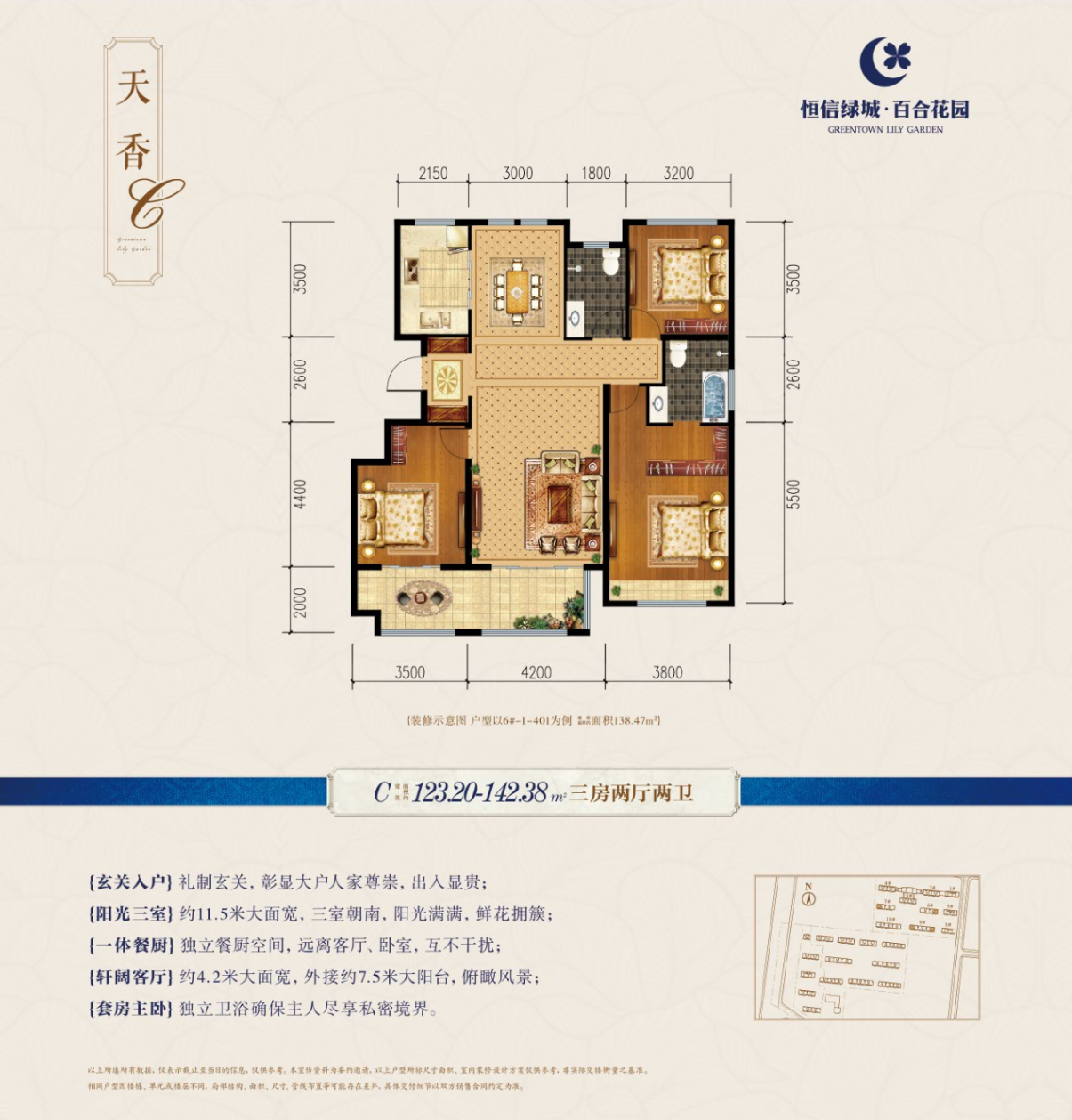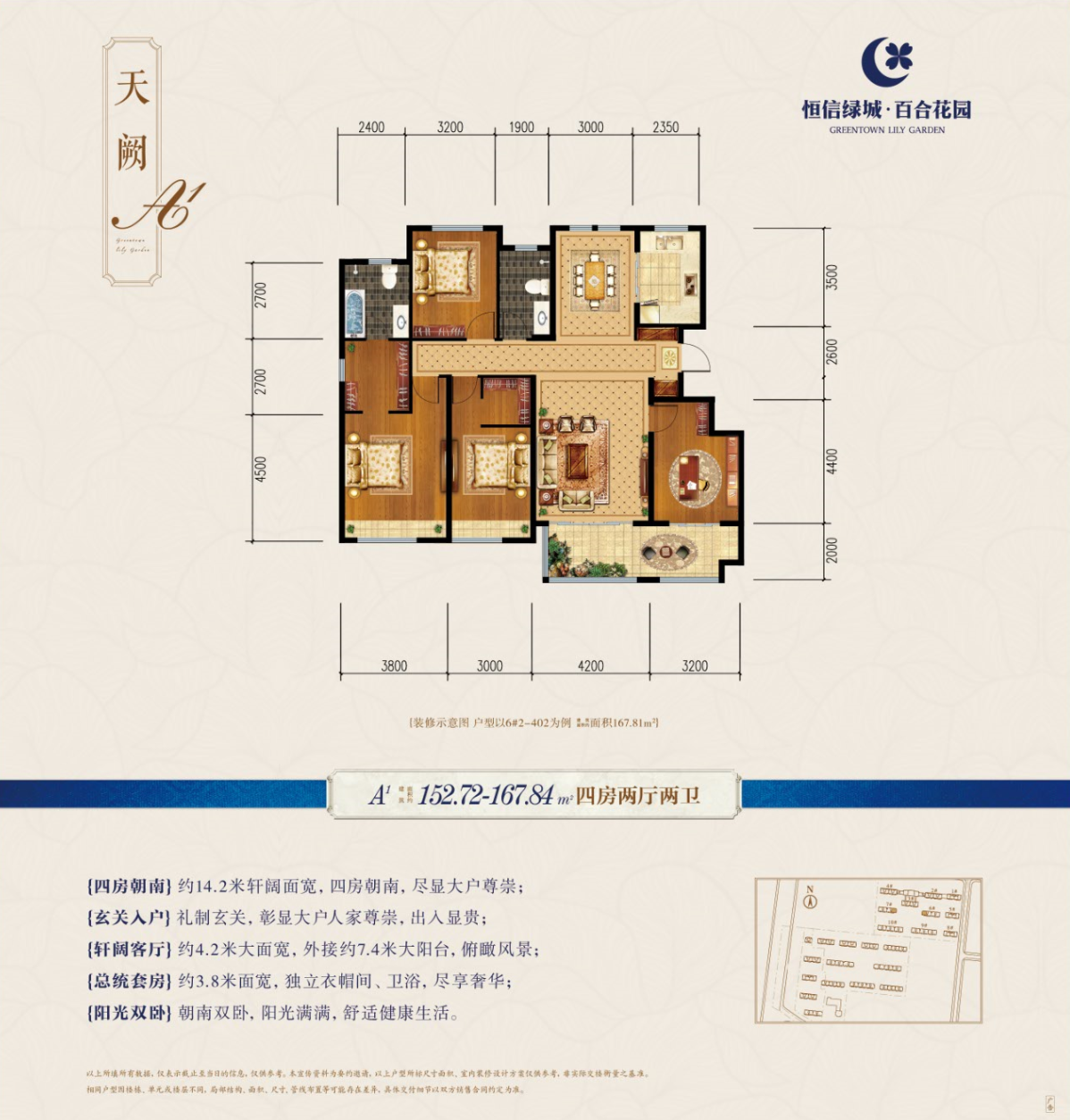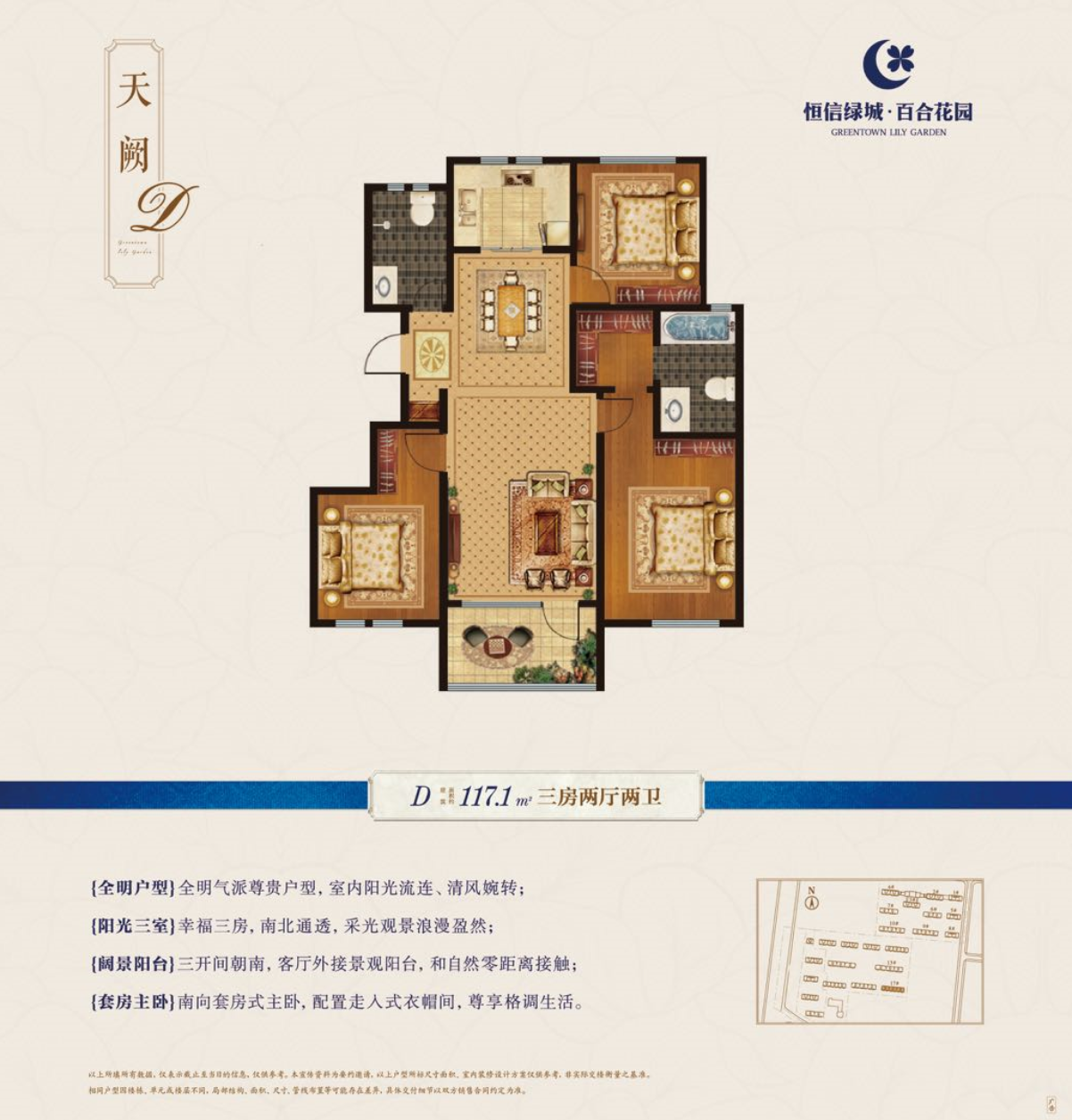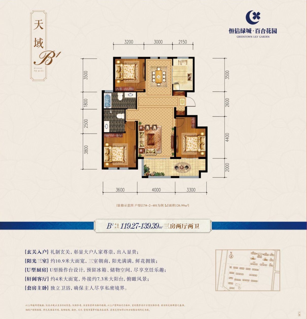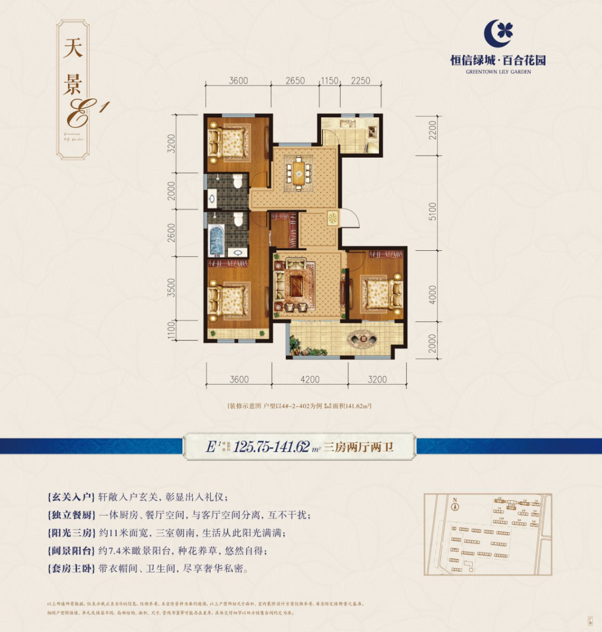恒信绿城·百合花园是临朐首家引入绿城品质的花园社区,荣膺2018年品质销量双冠王。总建面24万方,绿地面积超过1.7万方,是由潍坊龙头房企恒信集团投资开发,全国十强绿城发展代建管理,国家一级资质施工企业南通三建承建,采用浙江绿发园区服务。现在售三期,建面约117-169㎡绿城桂花系洋房、高层,焕新临朐品质人居新高度!项目位于临朐县兴隆东路创业大厦东临,广电大厦对面。联系电话0536-2112088 1000米内逛万达,功成名就住绿城。绿发服务,匹配最高贵的您,期待您成为绿城最尊贵的业主。