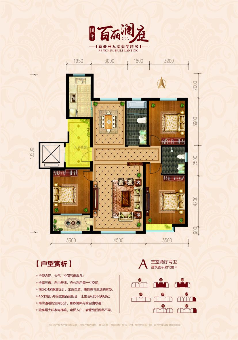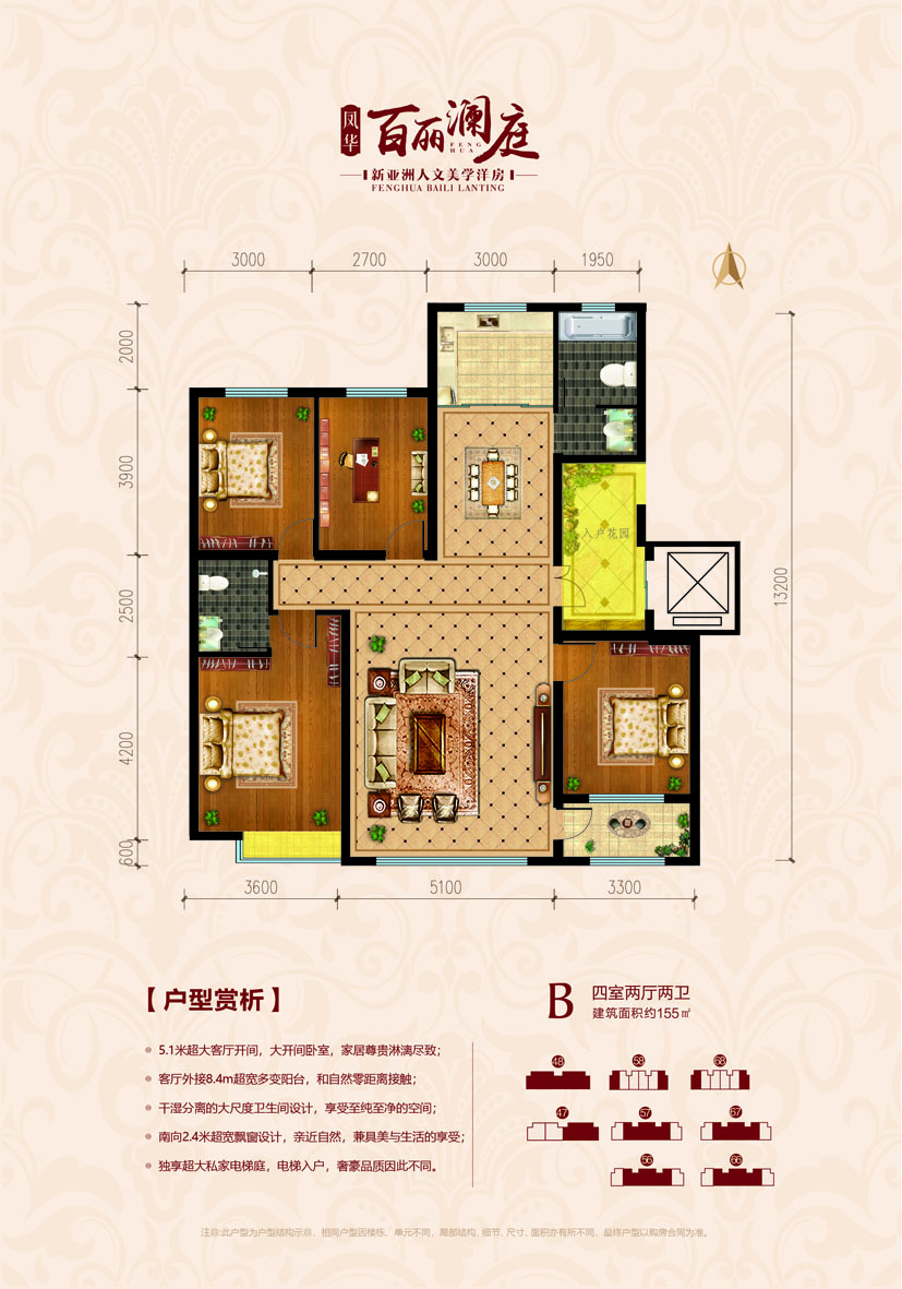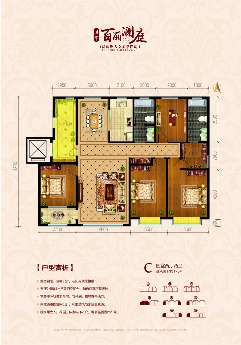 凤华·百丽澜庭由本土企业【乐义集团】开发,是乐义集团在寿光东城区打造的首个纯洋房品质宜居大盘,项目从树立寿光品牌社区理念出发,定位为寿光东城核心区域以优雅居住环境和高品质住宅为生态宜居豪宅典范。 项目总占地约300亩,总建面约计36万平方米,分四期开发。目前的地块为一期规划总户数约342户,共8栋包含47#、57#、67#、56#、66#5栋6层纯电梯洋房和48#、58#、68#3栋11层瞰景洋房。面积区间为133-176㎡,阳光三室、奢阔四室尽有。 所有楼座位置按照风水布局,采用围合式建设。一期项目设北主入口及东入口,步入项目内部园林,设计为国际级欧陆风情园林,营造出层层叠水,缓坡台地的园林美景。社区内部我们拥有35%的超高绿化率,园林中各种乔木灌木相互搭配,塑造5重景观的精致园林,营造出一个生机盎然,幽静宁静的景观环境,园林交相辉映,漫步园中是非常惬意的,给您呈现出怡人怡心经典院落。 凤华·百丽澜庭还专门配备了超1000平米的书香会所(园区自建图书馆),会所内设文娱多功能设施,后期您的健身娱乐在家门口就能完成,便捷度不是其他社区能比拟的,让您感受到高品质的生活与浓厚的文化氛围,社区图书馆也是孩子们在课余时间的不二之选,项目不惜重金建设高标准会所,为的就是业主的后期超高生活品质和舒适度。 项目设计同时结合环境,人文关系、城市形象和商业业态等方面进行了综合设计。整体规划追求高品位、综合性、品牌化和规模化,并结合生态、环保、人文理念,以原生生态为依托,重塑与自然和谐相处的生态环境健康人居形象。 百丽澜庭不仅仅是一座房子,更是您一生的家。